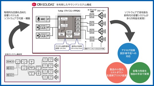 CRI SOLIDASはCRIが開発したデジタルサウンドソリューションです。汎用のワンチップマイコンやFPGA、Hブリッジ回路のみというシンプルなハードウェア構成で、高品質なサウンドの再生を実現します。ソフトウェアでの構成により、小型化、省電力化、コスト削減を実現する独自のサウンドシステムは、マルチチャンネルの立体音響も最小構成で実現可能です。