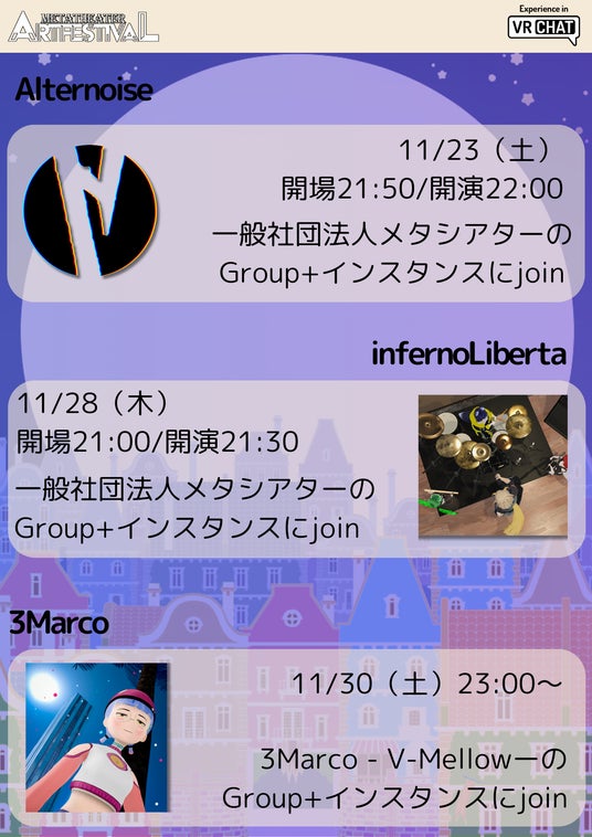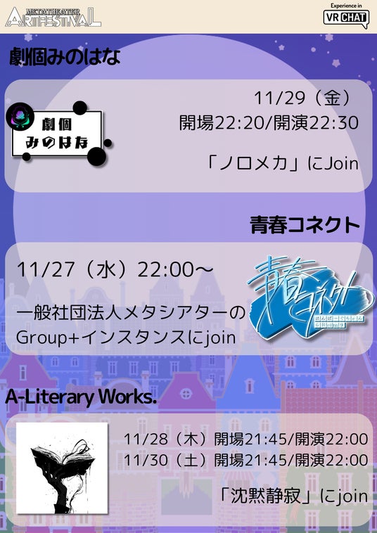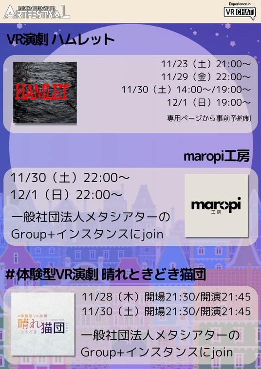 メタシアター演劇祭は、VRChatで活躍するパフォーマンスグループ、ダンサー、ミュージシャン、映画制作チームを特集するアートフェスティバルです。