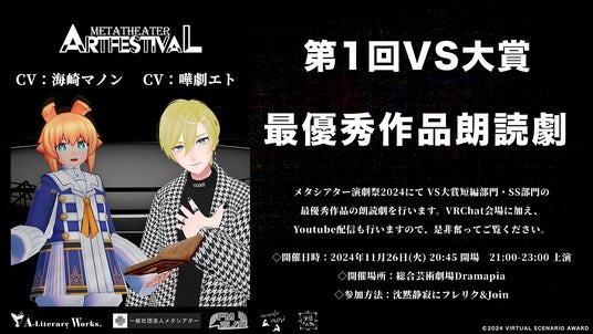 弊団体が共催しております、VRChatで活動する創作集団「A-Literary Works.」による「第1回バーチャルシナリオ大賞」の最優秀作品を朗読劇で上演いたします。