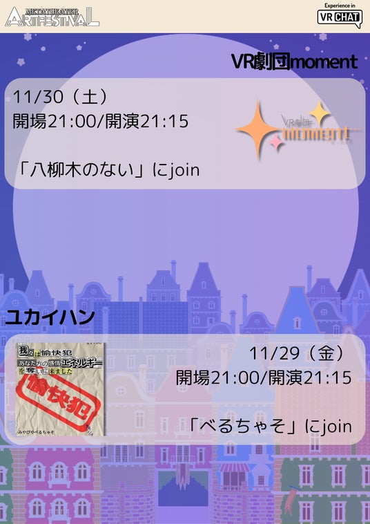 今年のフェスティバルは、昨年同様に演劇団体やアーティストが集まりパフォーマンスを中心に展開しいます。メイン会場では、VRChatのコミュニティのブース展示のほか、企業の出展もございます。