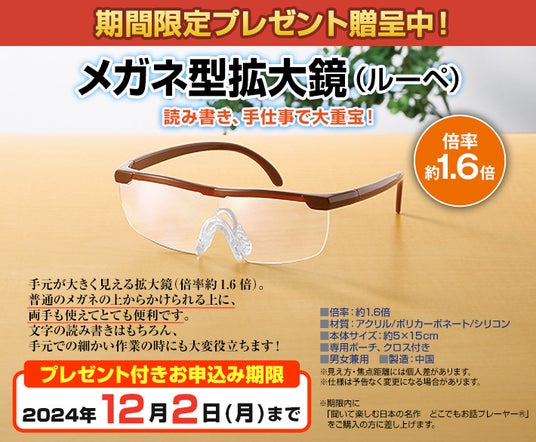 12月2日(月)までのキャンペーン期間中に本商品をご購入いただくと、期間限定プレゼント「メガネ型ルーペ」を贈呈いたします。