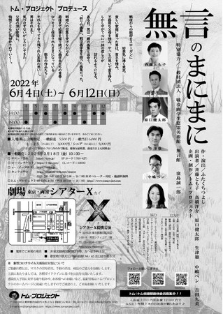 トム・プロジェクト(東京都渋谷区)主催、トム・プロジェクト プロデュース『無言のまにまに』が2022年6月4日 (土) 〜2022年6月12日 (日)に東京・両国 シアターΧ(東京都墨田区)にて上演されます。チケットはカンフェティ(運営:ロングランプランニング株式会社、東京都新宿区、代表取締役:榑松 大剛)にて3月11日(金)10:00より発売開始です。