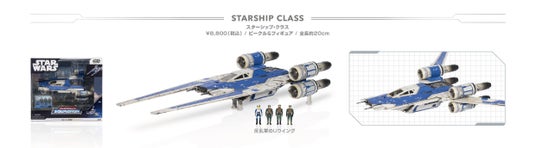 映画『ローグ・ワン/スター・ウォーズ・ストーリー』に登場する反乱軍のUウイングを、全長約20cmで立体化。小さいながらも細部までこだわりの造形で再現している。全高約2.5cm、手足が可動する、Uウイング・パイロット、3体の反乱軍兵士のアクションフィギュアが付属。