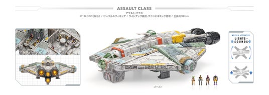 CGアニメ作品『反乱者たち』などに登場するゴーストを、全長約39cmで立体化。小さいながらも細部までこだわりの造形で再現している。全高約2.5cm、手足が可動する、ヘラ・シンドゥーラ、サビーヌ・レン、ケイナン・ジャラス、ゼブのアクションフィギュアが付属。