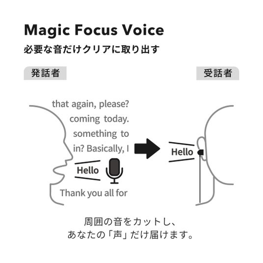 ― 必要な音だけ、クリアに取り出す声の特性を熟知し、開発された、NTTの特許技術「Magic Focus Voice」※。音が2つのマイクに到達する時間差を利用して音響空間を認識し、話者を特定する「ビームフォーミング」、雑音を除去して音声だけを抽出する「スペクトルフィルター」の2つの技術をハイブリッド処理。周囲の音をカットし、あなたの「声」だけ届けます。