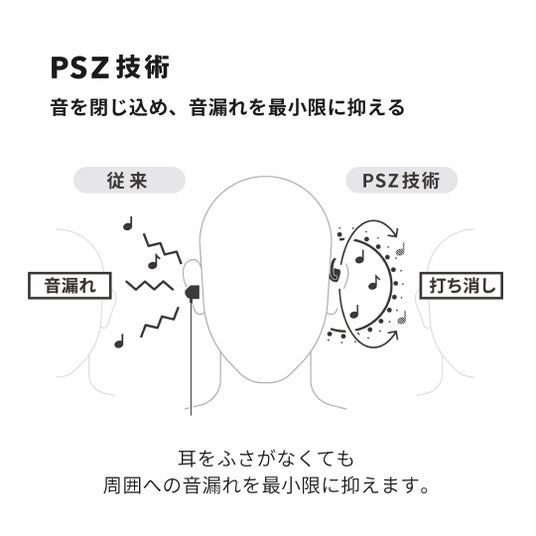 ― 音を閉じ込め、音漏れを最小限に抑える究極の矛盾を両立させる、NTT独自の「PSZ(パーソナライズドサウンドゾーン)」技術※。ある音波(正相)に対し180 度位相を反転させた波形(逆位相)を重ねると音が消える原理を応用。独自のハードウェア設計により耳元の一定エリアに音がとどまるため、耳をふさがなくても周囲への音漏れを最小限に抑えます。