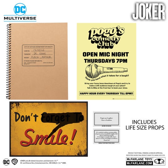 さらに「デラックス・コレクターセット」となる本アイテムには、映画に登場するプロップの実物大レプリカが付属。アーサーが使用するネタ帳のノート、ピエロの楽屋にある「Don’t Forget to Smile」のサインプレート(金属製)、アーサーが出演したコメディショーのポスター、アーサーがバスの乗客に見せる「Forgive my Laughter」のカードといった、リアルに再現された劇中の印象的なアイテムを手に入れることができる。