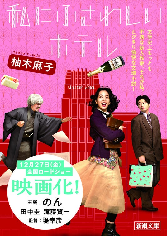柚木麻子さんが不遇な新人作家の奮闘を描いた小説『私にふさわしいホテル』(新潮文庫刊)が、のんさん主演、田中圭さん、滝藤賢一さんら出演、堤幸彦監督で映画化されます。2024年12月27日(金)から全国公開。映画化を記念して、映画のビジュアルを使用した全面幅広帯付き版を制作し、全国書店にて展開中です。