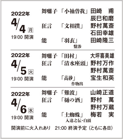 2日目(4/5火曜日):宝生和英 野村万作 野村萬斎 大坪喜美雄