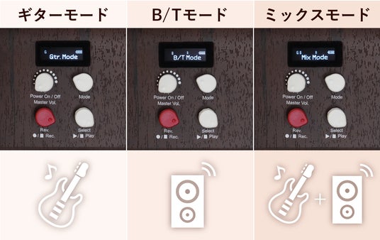 MOGABIスマートギターは、通常演奏の「ギターモード」に加え、Bluetoothでの音楽再生が楽しめる「B/Tモード」、そして音楽を再生しながら演奏を重ねる「Mixモード」の3つを搭載。