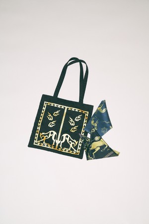 ファンタスティック・ビーストの美しいアートを使用した、中華風デザインのトートです。『ファンタスティック・ビーストとダンブルドアの秘密』で重要な魔法動物のチーリンがデザインされています。トートバッグはしっかりとした生地に、裏地はゴールドで高級感があります。スカーフはネイビーとブラックの2種類。大きめで、スカーフにしたりハンカチとして使ったり、様々な使い方ができます。
