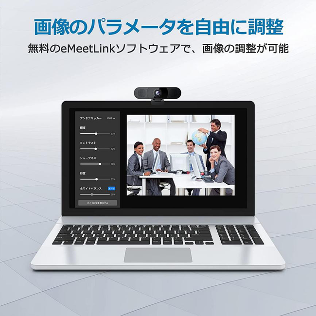 無料のeMeet Linkソフトウェアを使用することで、アンチフリッカー・輝度・コントラスト・シャープネス・彩度など各種パラメータを細かく調節することが可能の上、ファームウェアのアップグレードなども設定できます。