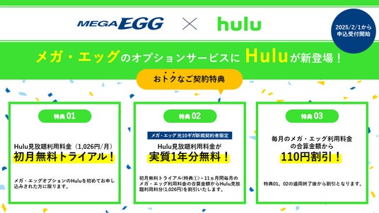 株式会社エネコム(本社:広島市、取締役社長:岡部 恵二、以下「エネコム」)は、2025年2月1日より、インターネット接続サービス「メガ・エッグ」のオプションサービスへオンライン動画配信サービス「Hulu」を追加いたします。さらに、おトクなHulu契約特典もご用意いたします。