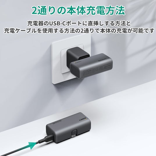 直挿し可能な内蔵USB-C端子以外に1つのUSB-Cポートが搭載されています。どちらの充電口も入力・出力の両方に対応。お手持ちの充電ケーブルを接続して、本体への入力または接続機器への出力が可能です。場面によって使いやすい充電方法の選択ができます。