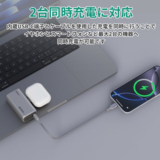内蔵USB-C端子とケーブルを使用した充電を同時におこなえば、スマートフォンとワイヤレスイヤホンなど最大2台の機器への同時充電が可能です。