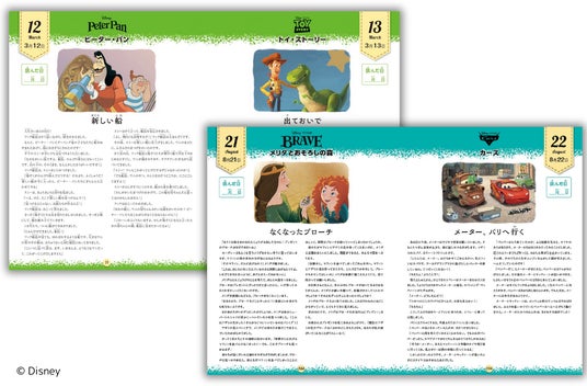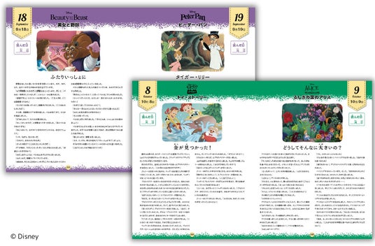 本書は、ディズニーの54作品から1年365日分のショートストーリーを1冊にまとめた物語集です。最多掲載数の『くまのプーさん』を始め、『トイ・ストーリー』、『アラジン』、『101匹わんちゃん』など、ディズニーの歴史を彩るそうそうたる作品が、1年間通じて楽しめます。普遍的なストーリーを繰り返し読むことで、感性豊かなお子さんに育つお手伝いをします。