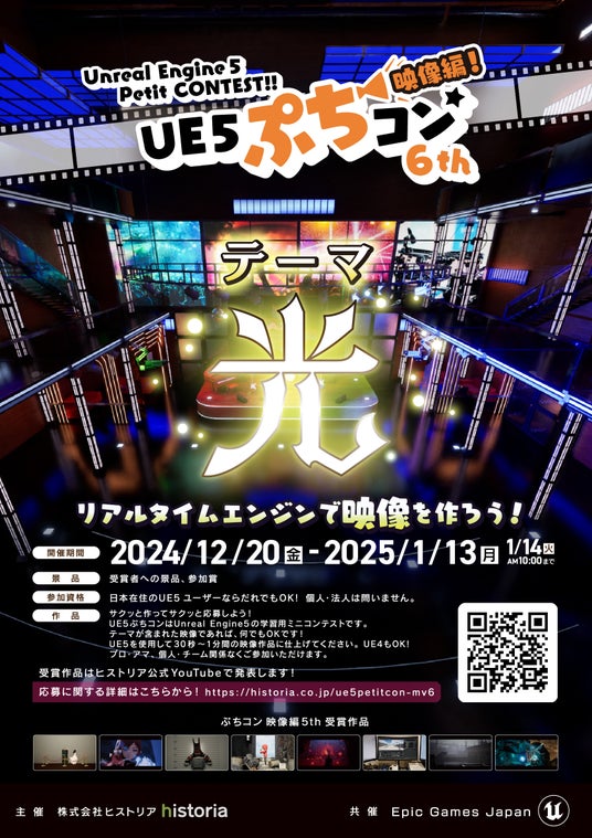 Unreal Engine(以下、UE)専門ゲーム開発会社 株式会社ヒストリアが主催するUE学習向けミニコンテスト“UE5ぷちコン”の番外編“UE5ぷちコン 映像編6th”のテーマを「光」と発表、作品エントリー受付を開始いたしました。2024年12月20日(金)〜2025年1月13日(月)の期間、エントリーを受け付けております。