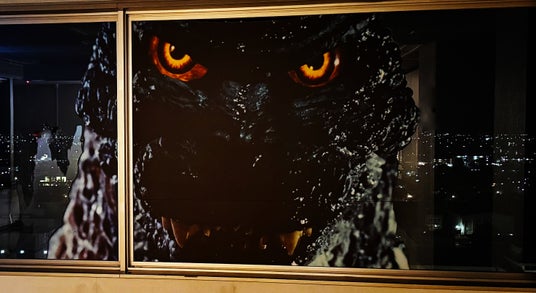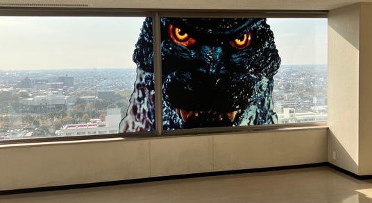 佐賀県庁新館最上階にある展望ホール(SAGA360)に窓の外から建物の中をのぞくゴジラの巨大ビジュアルが、2024年11月1日(金曜日)より出現。また、ゴジラの歴史を振り返るパネル展示も同時開催しています。