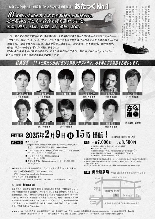 作・演出を務めるのは、劇団旗揚げから現在まで「方南ぐみ」企画公演作品の作・演出を全て手掛けてきた㭴田正剛。「青空」は犬と猫の気持ちを言葉として物語がつづられており、少年と動物のきずなを描いた優しい作品となっています。「あたっくNo.1」は㭴田の伯父が真珠湾に向かう伊18号艦内で書き綴った日記を手にしたことで、執筆することとなった作品。いずれも、決して忘れてはいけない、そして絶対に起きてはいけない戦争が背景にありつつも、見終えた後、必ず心温まる作品たちとなっています。