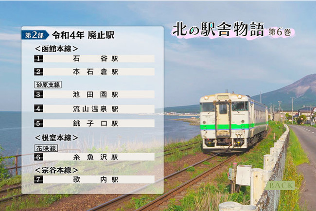 また他に「北の駅舎物語 第6巻」では令和4年3月12日のJR北海道ダイヤ改正により廃止される3線7駅の様子も同時に収録しました。中には、駒ヶ岳を望む函館本線 砂原支線の珍しい車窓風景も収められています。
