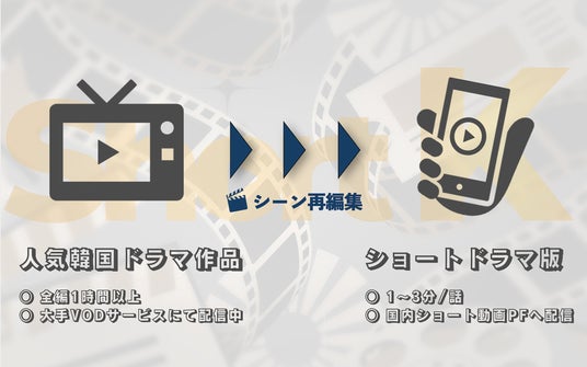 世界中で人気の韓国ドラマですが、本事業はAmazon Prime Videoなどの大手配信プラットフォームにて配信中の人気ドラマ作品を、ショート動画の形式(1話1〜3分)でシーン再編集を行い「ショートドラマ版」として国内プラットフォームへの販売・流通を行うという、これまでにない新たな取り組みからスタートいたします。
