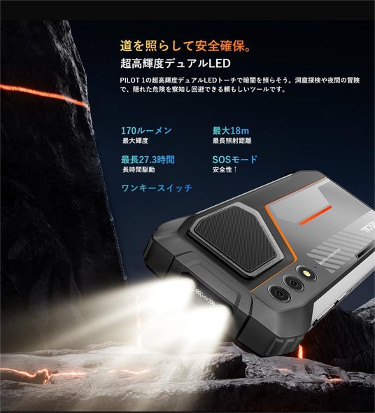 さらに超高輝度のデュアルLEDフラッシュライトを搭載し、暗闇をクッキリと照らし出せます。SOSモードもサポートしており、遭難などの緊急時に他者へ助けを求めることが可能。強力な内蔵スピーカーと合わせて、ユーザーの安全を守ることができるようになっています。