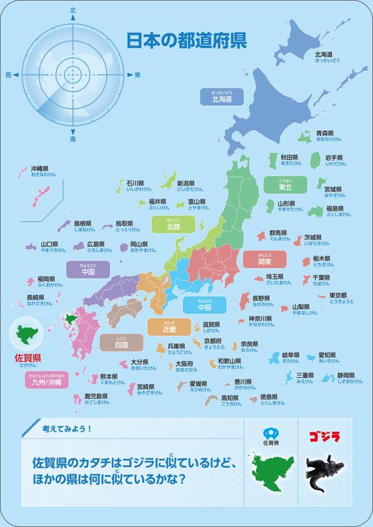 配布される下敷きには日本地図が描かれており、47都道府県の位置や名称を覚えることはもちろん、佐賀県とゴジラのように、他の都道府県の形が何のかたちに似ているか、楽しみながら考えるきっかけを提供します。