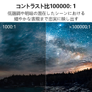 100000:1 の高コントラスト比低階調や明暗の混在したシーンにおける細やかな表現まで忠実に映し出すことができます。高画質の映像コンテンツを楽しむ時、普通の忠実に映像の描写が再現できないコントラスト比の低い機器と比べて、制作者や演者の意図をより深く理解し、新しい映像の視聴体験を提供します。