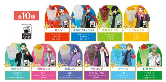 コラボドリンクは、「一条シン」「太刀花ユキノジョウ」「香賀美タイガ」「十王院カケル」「鷹梁ミナト」「西園寺レオ」「涼野ユウ」「神浜コウジ」「速水ヒロ」「仁科カヅキ」をイメージした全10種をご用意します。