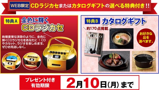 2月10日(月)までのキャンペーン期間中にWEBサイトからお申込みいただきますと、本セットにお付けするプレゼントを「CDラジカセ」か「カタログギフト」のいずれかひとつ、お選びいただけます。