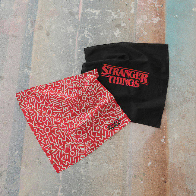 ストレンジャー・シングスのロゴをあしらったり、裏側の世界を80’s風デザインにしたアートをプリントしたりした、ユニセックスのバンダナです。ヘアアクセサリーやバッグの飾りとしてもお使いいただけるアイテムです。