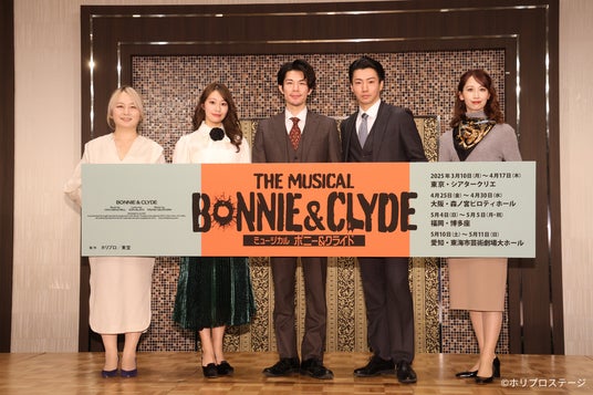 今年3・4月にシアタークリエにて開幕するミュージカル『ボニー&クライド』の製作発表記者会見が1月31日(金)に開催された。柿澤勇人・矢崎 広・桜井玲香・海乃美月・瀬戸山美咲(上演台本・演出)の5名が登壇し、「潜入捜査官」として招待した一般オーディエンスに、本番では観ることのできないのスペシャルバージョンで劇中より計2曲を披露した。東京公演チケットは絶賛販売中!