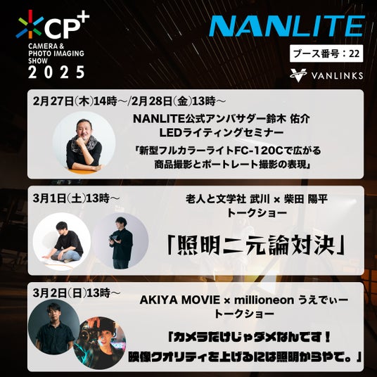 LED照明ブランドの「NANLITE」「NANLUX」や機材保護ケースブランド「GUTEK」を展開するVANLINKS株式会社(本社:新宿区)は、2025年2月27日(木)から3月2日(日)までの期間パシフィコ横浜にて開催される「CP+2025」に出展しますことをお知らせいたします。