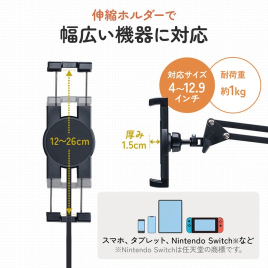 4〜12.9インチまでに対応し、挟み込むことで固定できます。クランプ部は、縦・横挟みに対応し、厚さ0.5〜7.5cmまで対応します。