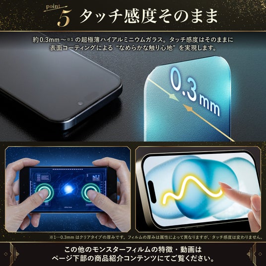 ※1. 0.3mmはクリアタイプの厚みです。フィルムの厚みは種類によって異なりますが、タッチ感度は変わりません。