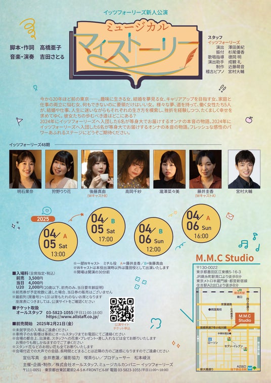 株式会社オールスタッフ、ミュージカルカンパニー イッツフォーリーズでは2025年4月5日(土)〜6日(日)に、M.M.C Studioにおきまして、新人公演ミュージカル『マイストーリー』の公演を行います。本作品は、篠田節子の直木賞受賞作をもとにミュージカル『女たちのジハード』としてアトリエフォンテーヌで2007年に初演。90年代の女性たちが奮闘する様子をイッツフォーリーズがミュージカルとして描きました。その後、設定を変え、タイトルも『マイストーリー』として改め、2015年、2019年に再演。新人公演としても41期が2018年に上演いたしました。今回は2024年にイッツフォーリーズに入団した48期・6名が、自分たちの物語として、オンナたちの本音を等身大で描いていきます。演出、振付などスタッフには、本作品を新人公演として演じた41期のメンバーが携わります。次世代のイッツフォーリーズを担うフレッシュな感性にどうぞご期待ください。