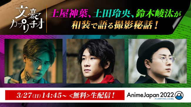 AnimeJapan 2022のアニマックスブースのステージから『文豪カプリチオ』に出演する土屋神葉、土田玲央、鈴木崚汰の三人が無料生配信!『文豪カプリチオ』で身に着けた和装で登場し、撮影中の裏側や今回の作品に対する思い等を語ります。
