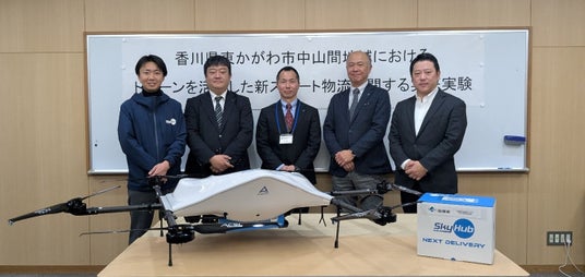 株式会社NEXT DELIVERY (本社:山梨県小菅村、代表取締役:田路圭輔、以下NEXT DELIVERY)、キヤノンマーケティングジャパン株式会社(本社:東京都港区、代表取締役:足立正親、以下キヤノンマーケティングジャパン)、セイノーホールディングス株式会社(本社:岐阜県大垣市、代表取締役社長:田口 義隆、以下 セイノーHD)、株式会社電通西日本(本社:大阪府大阪市、代表取締役社長 川口 真義、以下 電通西日本)は、環境省委託事業「運輸部門の脱炭素化に向けた次世代型物流促進事業(脱炭素化を加速させる新スマート物流に関する実証)」において、物流専用ドローンを活用した「物流の効率化、および買い物困難者問題」解決に向けた共同配送実証実験を、2025年2月6日に香川県東かがわ市で行い、報道関係者へ公開しました。