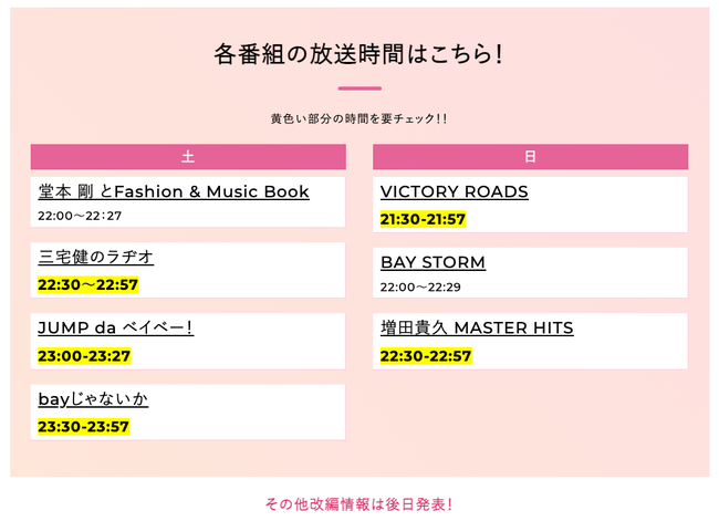 bayfm春の改編情報:ジャニーズ事務所所属アーティストの人気プログラム放送日時変更のお知らせ