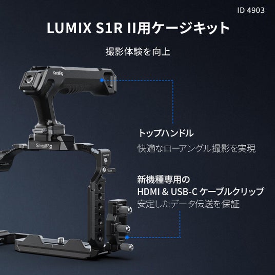LUMIX S1R II用ケージキット4903には、ケージ、トップハンドルとケーブルクリップが含まれており、軽量なトップハンドルにより快適なローアングル撮影が可能です。新機種専用のHDMI & USB-Cケーブルクリップは、安定したデータ伝送を保証します。