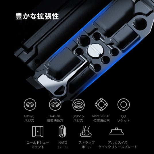 LUMIX S1R II / S5 II / S5 IIX / G9 II 用ケージ4902は、ねじれ防止の三点ロックシステムを採用しており、安定性を向上させます。ケージの底部はアルカスイス形状で、三脚とDJI RSシリーズスタビライザー間でスムーズにカメラを移行できます。また、1/4"-20 ネジ穴、3/8"-16ネジ穴、コールドシューマウント、NATOレールなど、複数の拡張用インターフェースを備え、さまざまなアクセサリーを自由に搭載することが可能です。