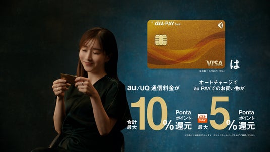 「au PAY カード」「au PAY ゴールドカード」(注4)は、日々のお買い物や公共料金のお支払いにも幅広くお使いいただくことができ、カードのご利用で100円ごとに1ポイントを還元。ご利用に応じてたまったPontaポイントは、au PAY 残高へのチャージやクレジットカードの請求額への充当などにご利用いただけます。また、「au PAY ゴールドカード」ではau携帯電話/UQ mobileの通信料金をお支払いいただくと合計最大10%のPontaポイントを還元する通信ご利用料金特典や、au PAY 残高にオートチャージ(注5)し特定の条件を達成すると、オートチャージ金額に対してPontaポイントを還元する、ポイントアップリワード(オートチャージ特典)を提供しています。さらに、KDDIの提供するauのスマートフォン向け料金プラン「auマネ活プラン+」の特典と組み合わせると、au PAY 決済ご利用時にポイントが最大10%還元となり、通信と金融の両面からお客さまのおトクを追求したクレジットカードとなっています。