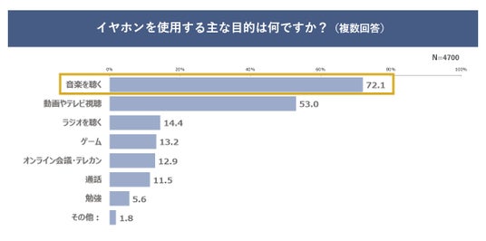 ■イヤホンを使用する主な目的1位は「音楽を聴く」で7割。