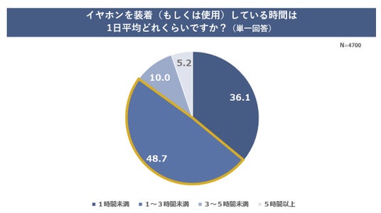 イヤホンを装着(もしくは使用)している時間は1日平均どれくらいかを聞いたところ、全体で最も多かったのは「1〜3時間未満」で48.7%という結果に。約半数の人が1日1〜3時間程度イヤホンを使用していることが分かりました。