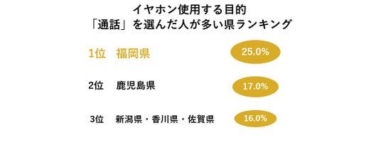 イヤホンを使用する主な目的を聞いたところ、1位は「音楽を聴く」で72.1%と圧倒的な結果に。エリア別では「オンライン会議・電話会議」を選んだ人が多い県1位は「東京都」と「兵庫県」で共に23.0%となりました。また、「通話」での使用1位は「福岡県」で25.0%、次いで「鹿児島県」で17.0%と続きました。都心部ではイヤホンはオンライン会議など仕事での使用が多い一方で、九州地方では音声通話を中心としたコミュニケーションでの使用が多いことがわかり、使用目的から地域ごとの特徴が見える結果となりました。
