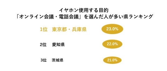 《イヤホンを使用する主な目的1位は「音楽を聴く」で7割。エリア別では、「オンライン会議・電話会議」の1位が「東京都」と「兵庫県」の同率。