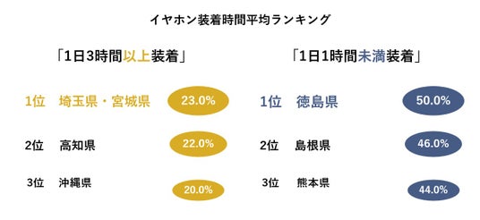 《イヤホンを1日3時間以上装着する人が最も多いのは「埼玉県」「宮城県」で同率1位。一方で、1時間未満の人が多いのは「徳島県」、「島根県」と続く。島根県では普段の移動手段1位が「自家用車」であることから、移動手段がイヤホンの使用時間に影響》