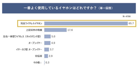 続いて、一番よく使用しているイヤホンタイプを聞いたところ、「完全ワイヤレスイヤホン」が65.7%となり、コードレスの利便性が支持され、イヤホン市場の主流となっていることが明らかとなりました。