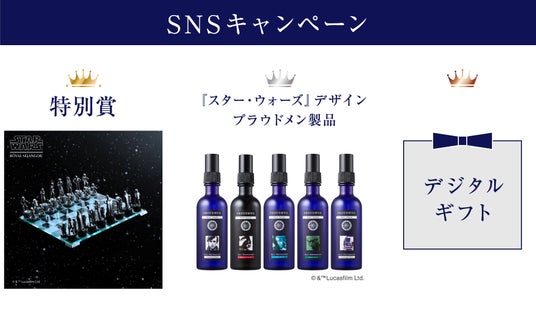 プラウドメンのX公式アカウントをフォローし、対象の投稿のリポストで応募可能なキャンペーン。抽選で『スター・ウォーズ』の豪華チェスセットやプラウドメンの『スター・ウォーズ』デザイン製品、デジタルギフトが当たります。
