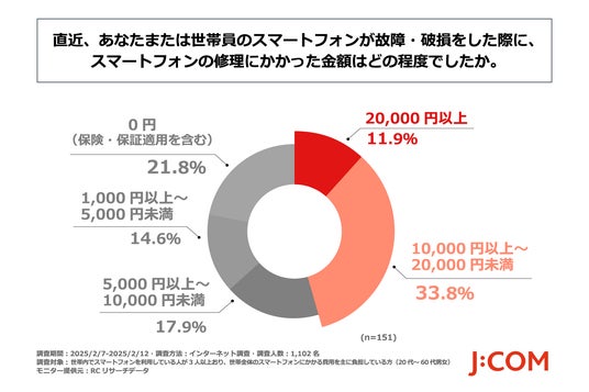 次に、直近でスマートフォンの修理可能な故障・破損を経験した際に修理したと回答された方に「スマートフォンの修理にかかった金額はどの程度だったか」を尋ねる設問への回答では、「10,000円以上〜20,000円未満」で33.8%、「20,000円以上」が11.9%という結果になりました。この結果から、スマートフォンの修理には10,000円以上かかった人が約5割にのぼることがわかりました。
